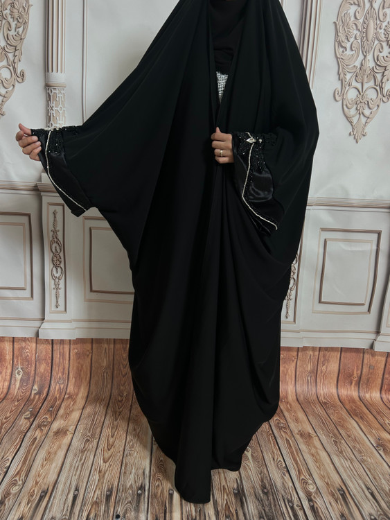 چادر شیک سبک: چادر یاسمین آستین مخمل دوزی جواهردوزی جنس ژورژت کره سایز ۱۶۰ ۱۶۵ مشکی بسیار ریزشدار کار شیک